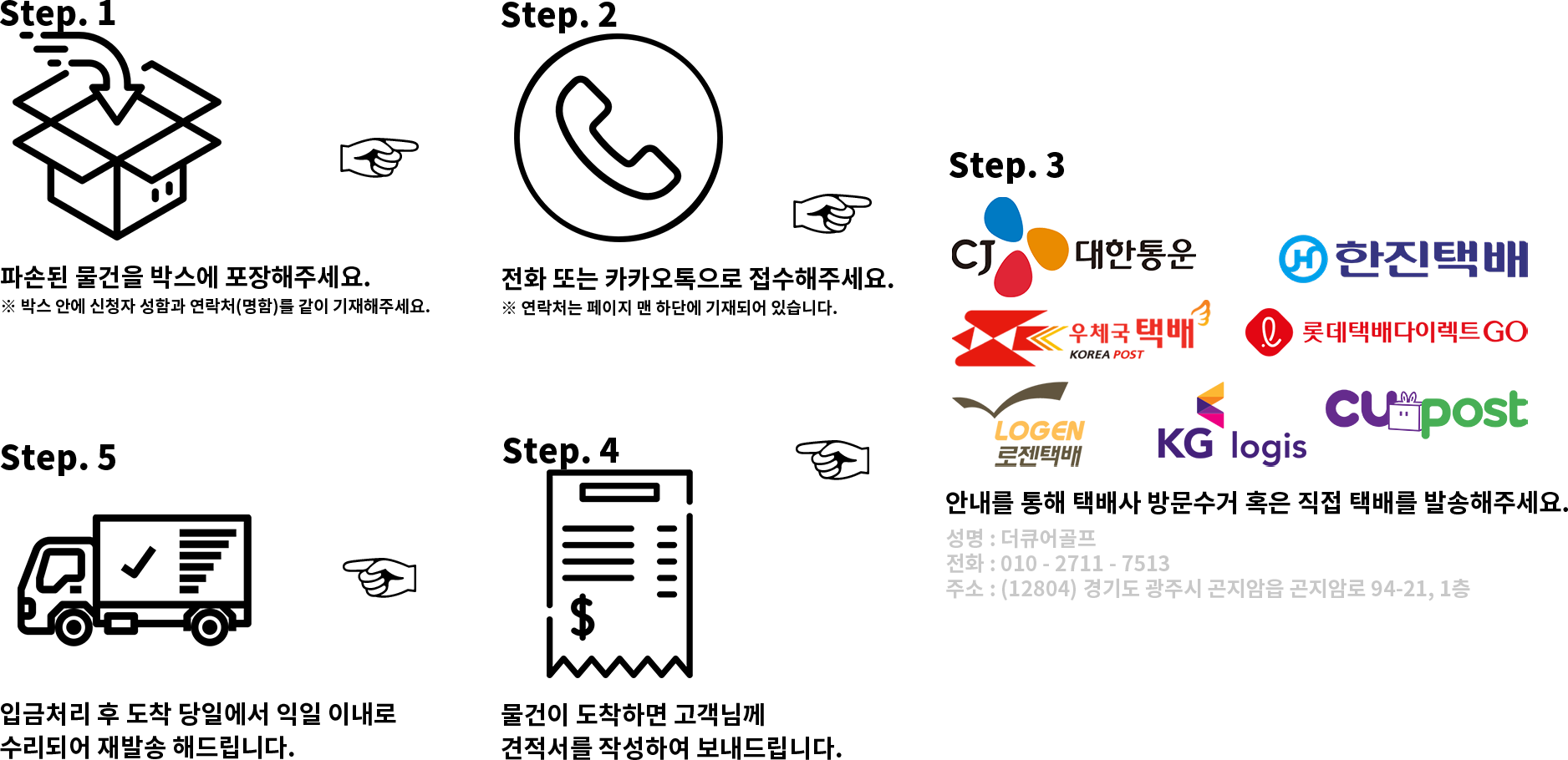 ※ 택배 1차 발송 비용은 고객 측에서 부담, 수리 후 2차 발송 비용은 더큐어골프에서 부담합니다.